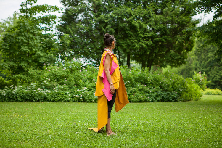 Migration est un vêtement inspiré de la rencontre avec Aparna, une femme originaire de l'Inde récemment établie au Canada. L'oeuvre représente le passage d'une culture à l'autre et propose une interprétation personnelle du parcours migratoire d'Aparna. Ici, les couleurs vives, les motifs et les drapés caractéristiques du vêtement traditionnel indien (sari) sont combinés avec certaines composantes de la chemise, symbolisant le vêtement occidental. Le dédoublement du vêtement forme un appendice que l’on porte sur l’épaule, évoquant à la fois une présence et son absence.